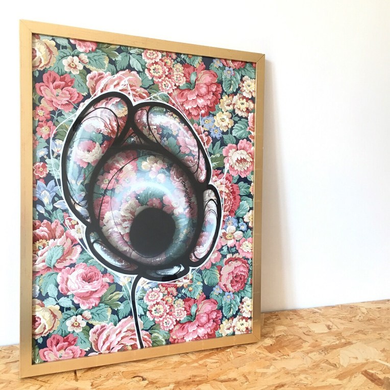 Panonerpan flower sur papier peint ancien 1/4 avec cadre doré en prise de photo à la maison. 50x65cm. Numéroté et signé. C’est ici que je prends en photo la plupart de mes toiles car la luminosité est parfaite.