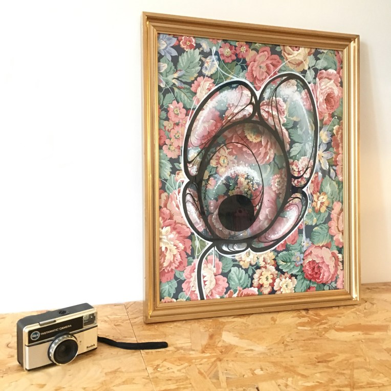 Panonerpan flower sur papier peint ancien 2/4 avec cadre doré. 45x55cm. Numéroté et signé. Pour l’échelle, l’appareil photo de mes 9 ans 🙂