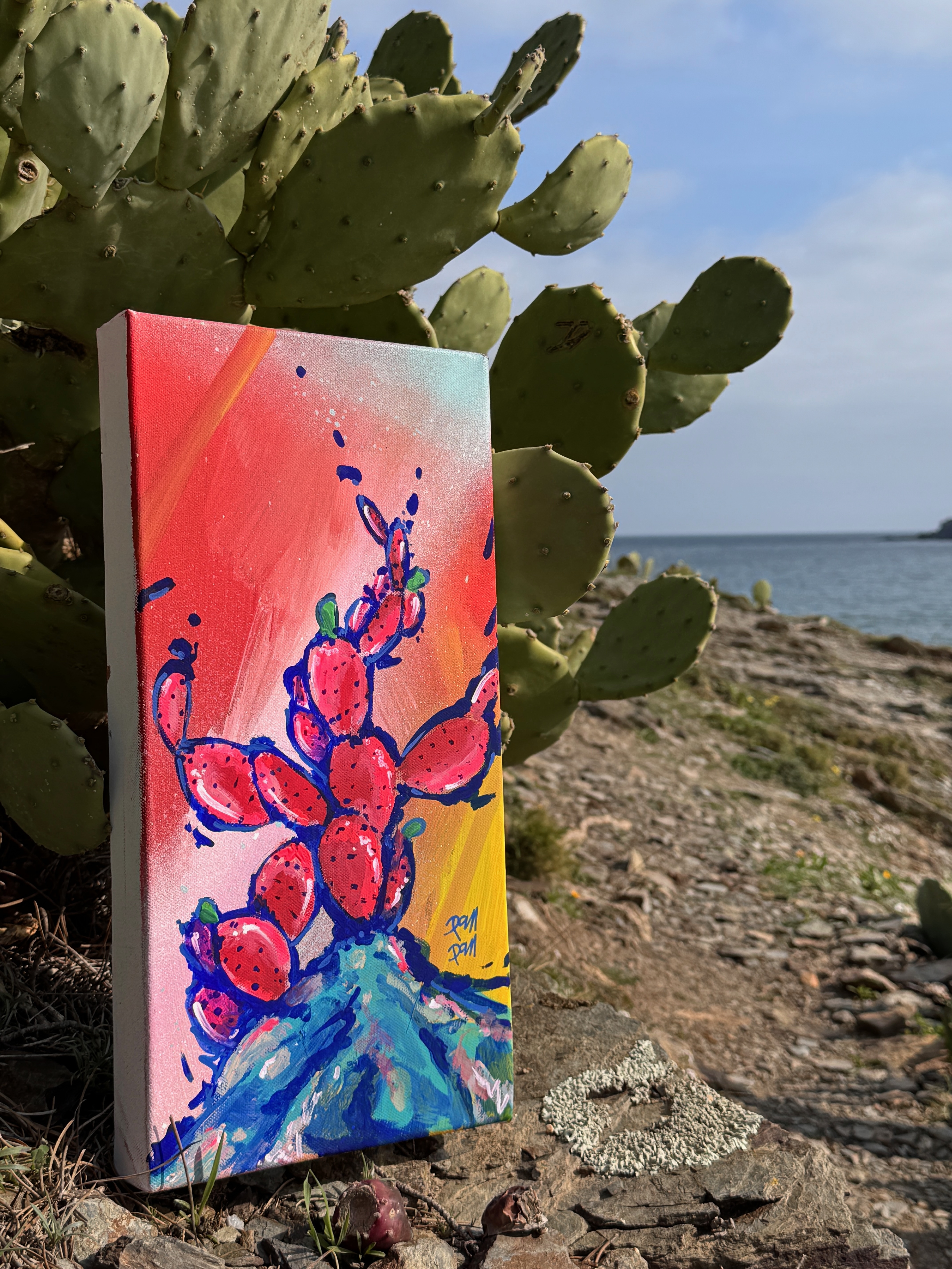 Pendant près de 15 jours, sur les pas de Matisse, Maillol et Derain, je me suis immergé dans un paysage lumineux, coloré, où l’hiver n’existe pas. Une série de trois toiles peintes sur chevalet est le fruit de cette expérience. « Le port de Port-Vendres, vu de la terrasse », inspiré d’une peinture d’André Derain et du poème La Traversée de Guillaume Apollinaire. « La deuxième plage rouge de Collioure », est une représentation du moment du tournage du clip illustrant le morceau l’été infini de Brume Parole. Et enfin, « le cactus de Banyuls » est directement inspiré par la visite dans la maison de Maillol, au fond de la vallée de la Roume, vallée aride, recouverte d’Opuntia.