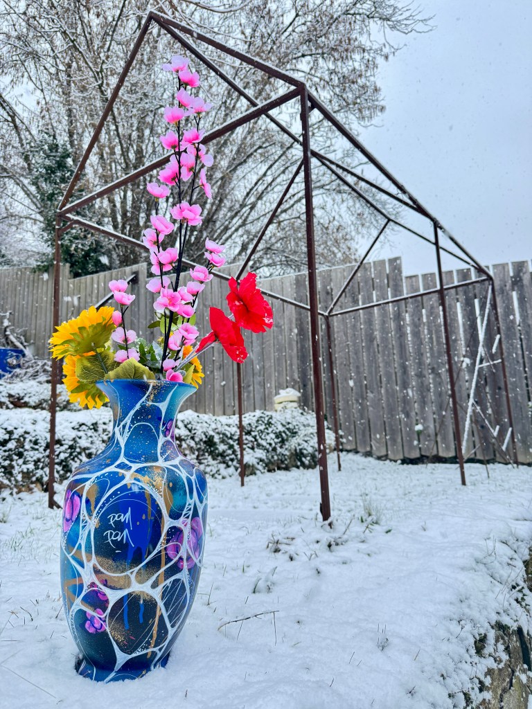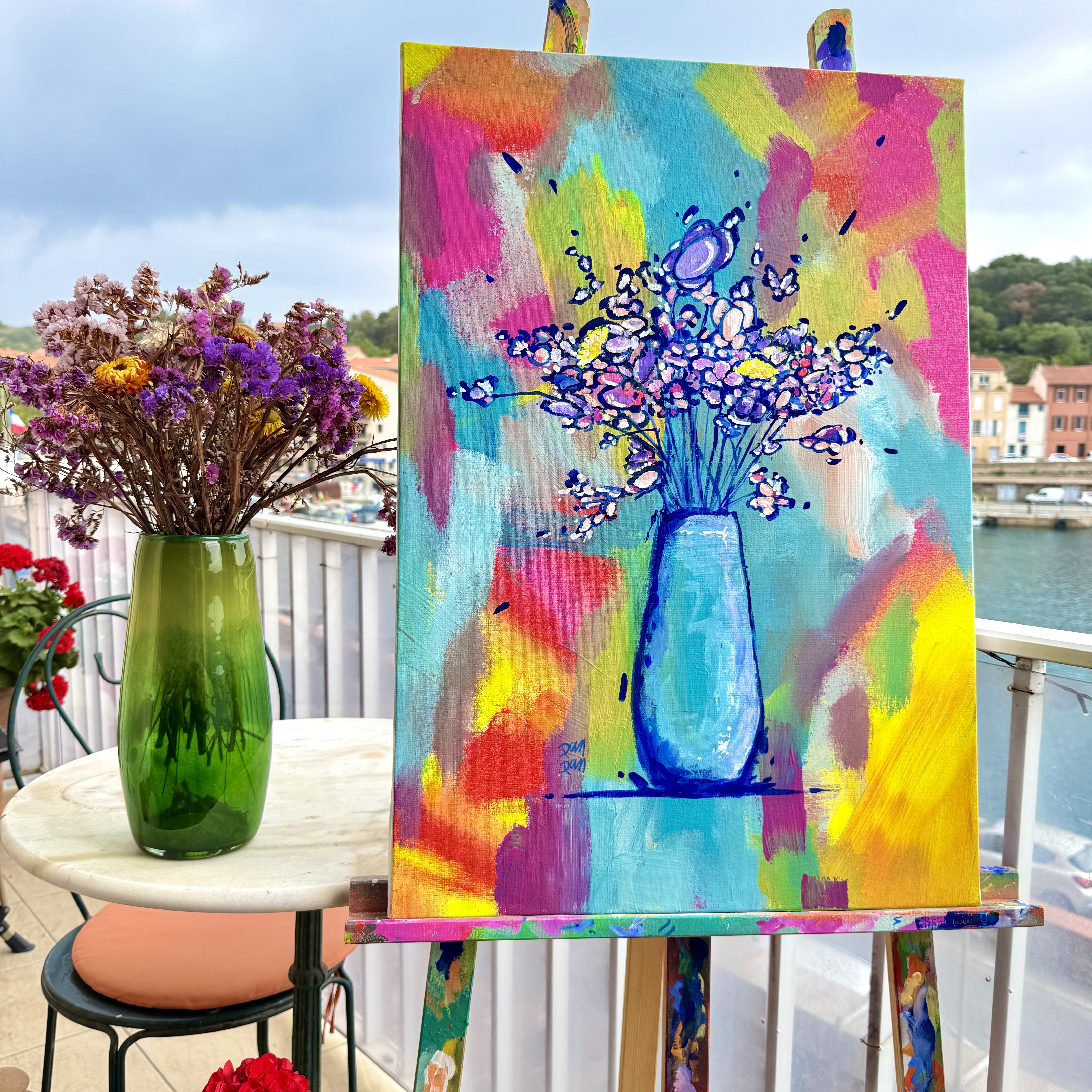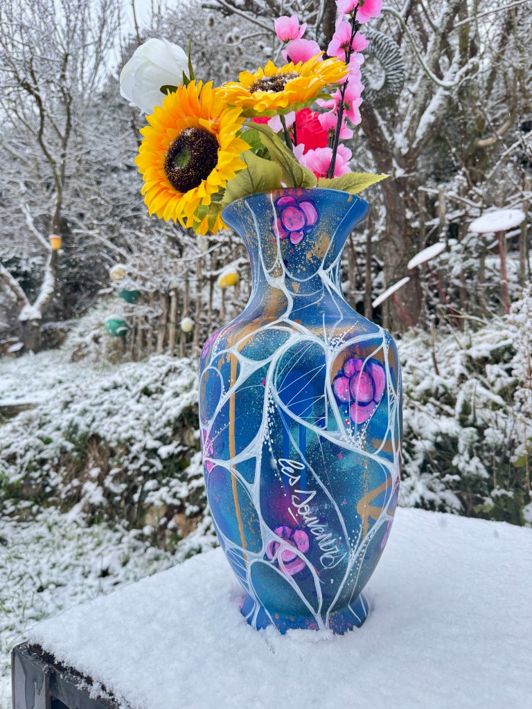 - Janvier 2026 : « Le vase des souvenirs », peinture aérosol et acrylique sur vase, 43 cm de haut. Les souvenirs sont comme des strates transparentes. Ils se superposent et s’accumulent, remodelant notre paysage intérieur. La sédimentation est continue, nourrie par nos sens et diffractée par nos émotions. Les matières, les textures, les couleurs se répondent et composent le tableau de notre vie. Ce recouvrement floral incessant n’est pas le fruit du hasard : il peut être dévié par nos choix et par notre sentiment de l’instant. Soyons lucides sur la beauté de chaque moment. Composons cette fresque avec passion car les pigments utilisés sont trop éphémères.