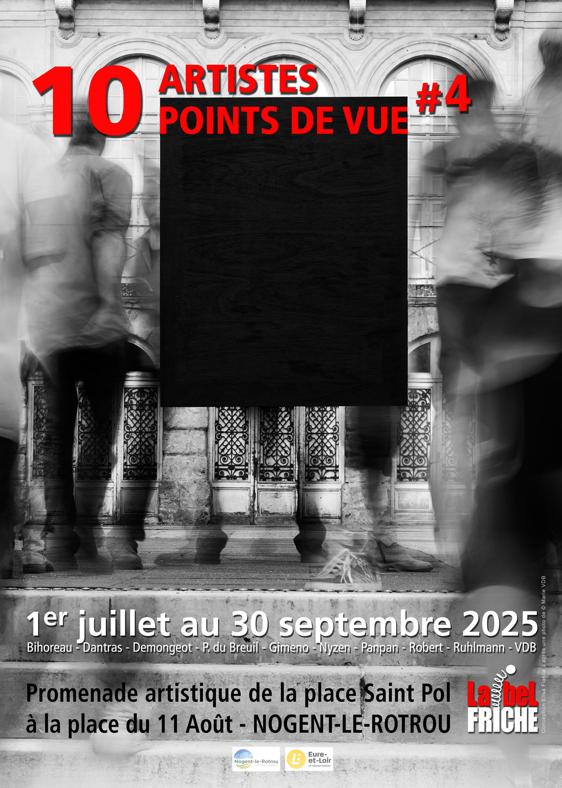 - Juillet / aout / septembre 2025 : exposition collective 10 artistes, 10 points de vue, organisée par l’association LabelFriche à Nogent-le-Rotrou (28).
