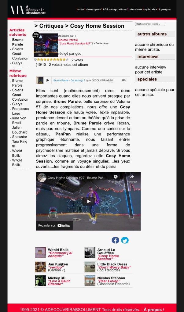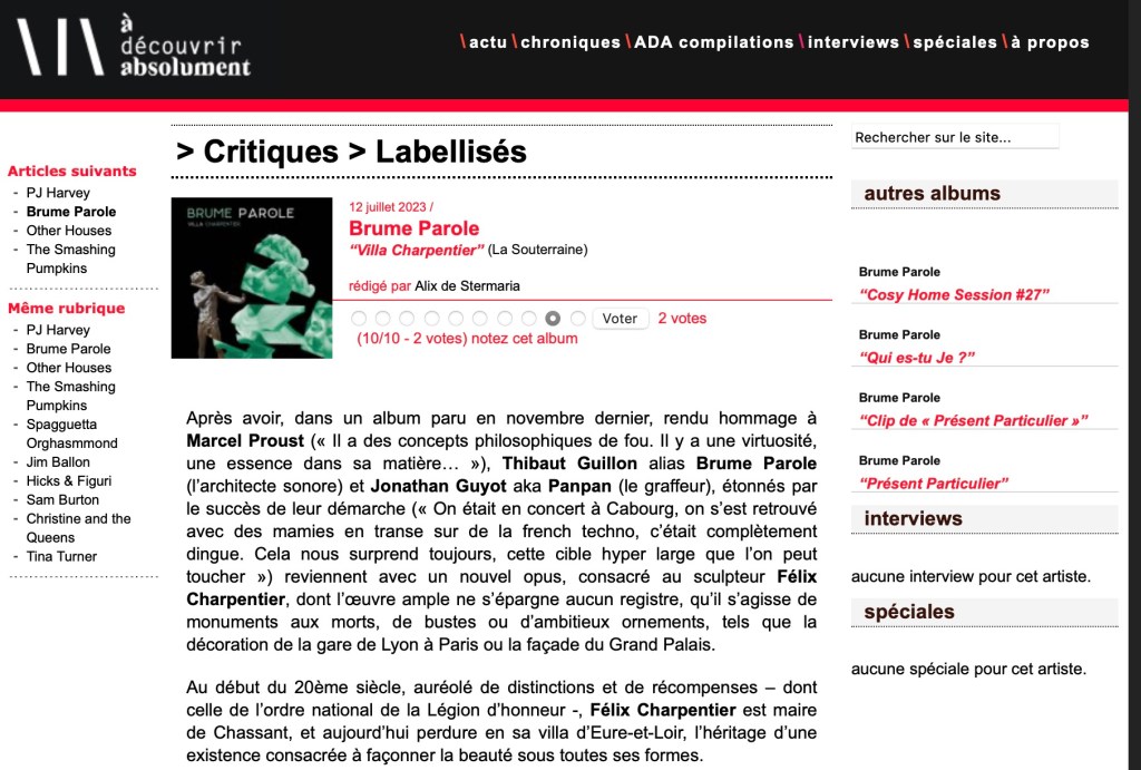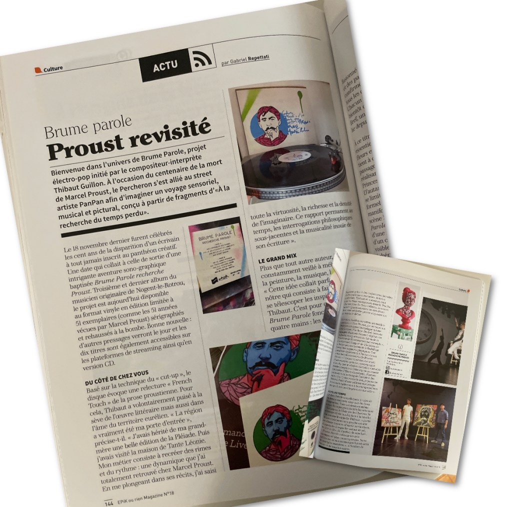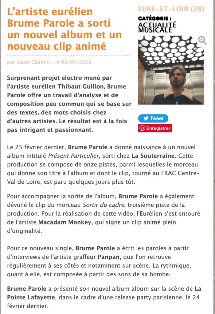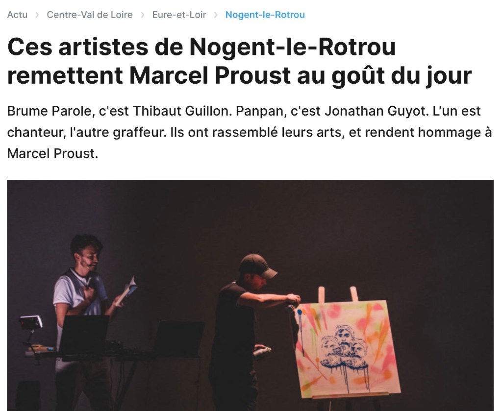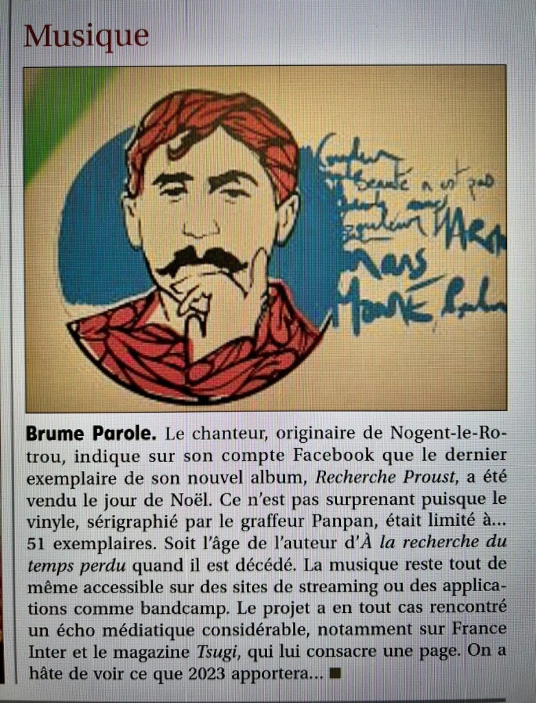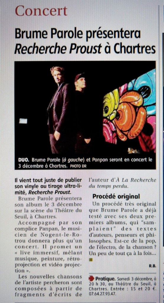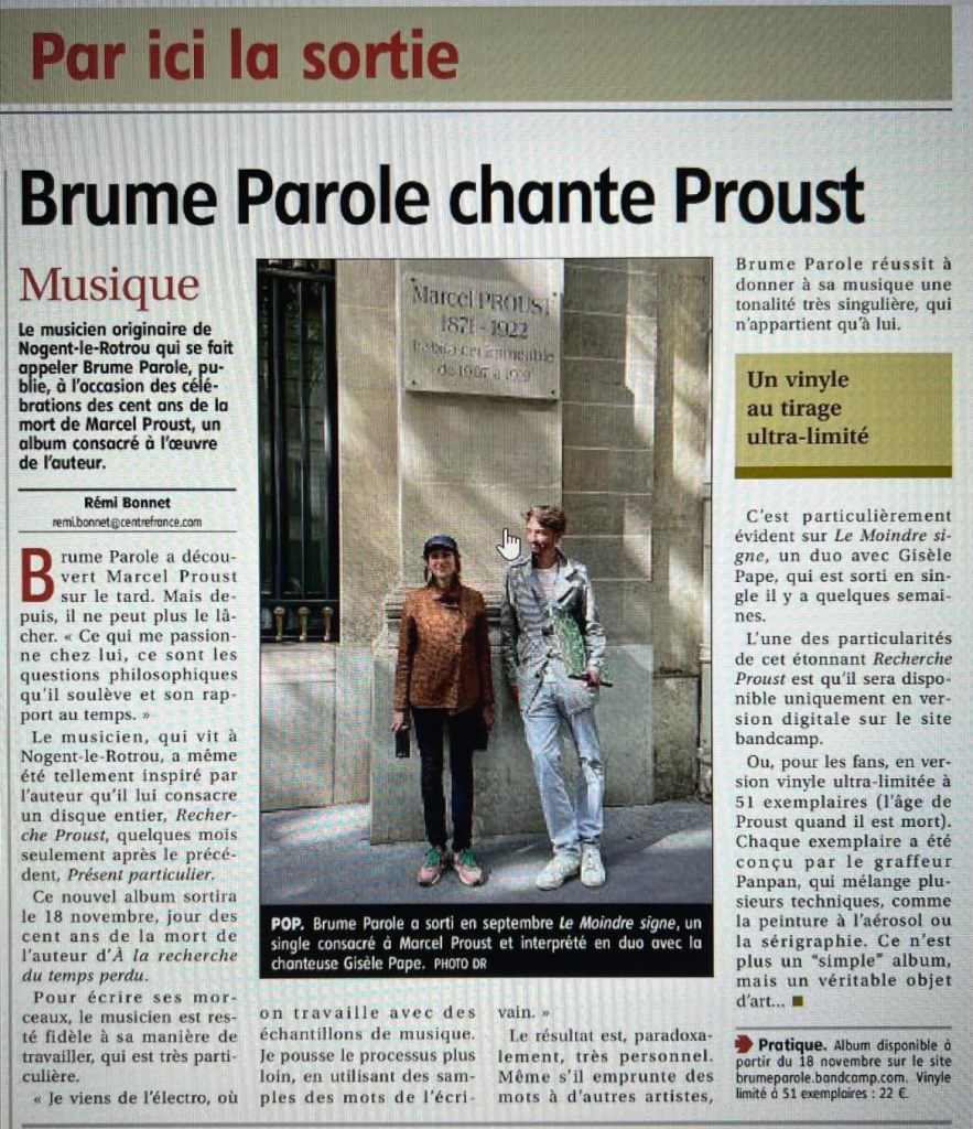 Novembre 2023, l’Action républicaine, Un nouvel album pour Brume Parole qui clôture la parenthèse Proust. https://actu.fr/centre-val-de-loire/nogent-le-rotrou_28280/un-nouvel-album-pour-brume-parole-qui-cloture-la-parenthese-proust_60378634.html