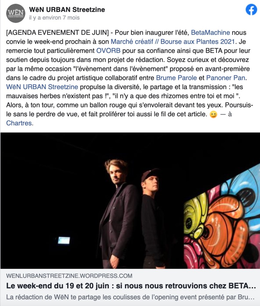 12/06/2021 WEN URBAN STREETZINE : Le week-end du 19 et 20 juin : si nous nous retrouvions chez BETAMACHINE pour l’invitation au marché créatif ?