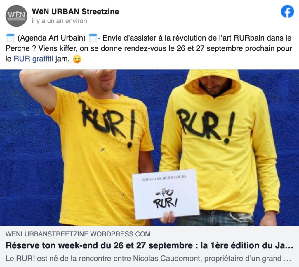 08/09/2020 WEN URBAN STREETZINE : Réserve ton week-end du 26 et 27 septembre : la 1ère édition du Jam Graffiti made in Perche le « RUR ! » : s’annonce swag !