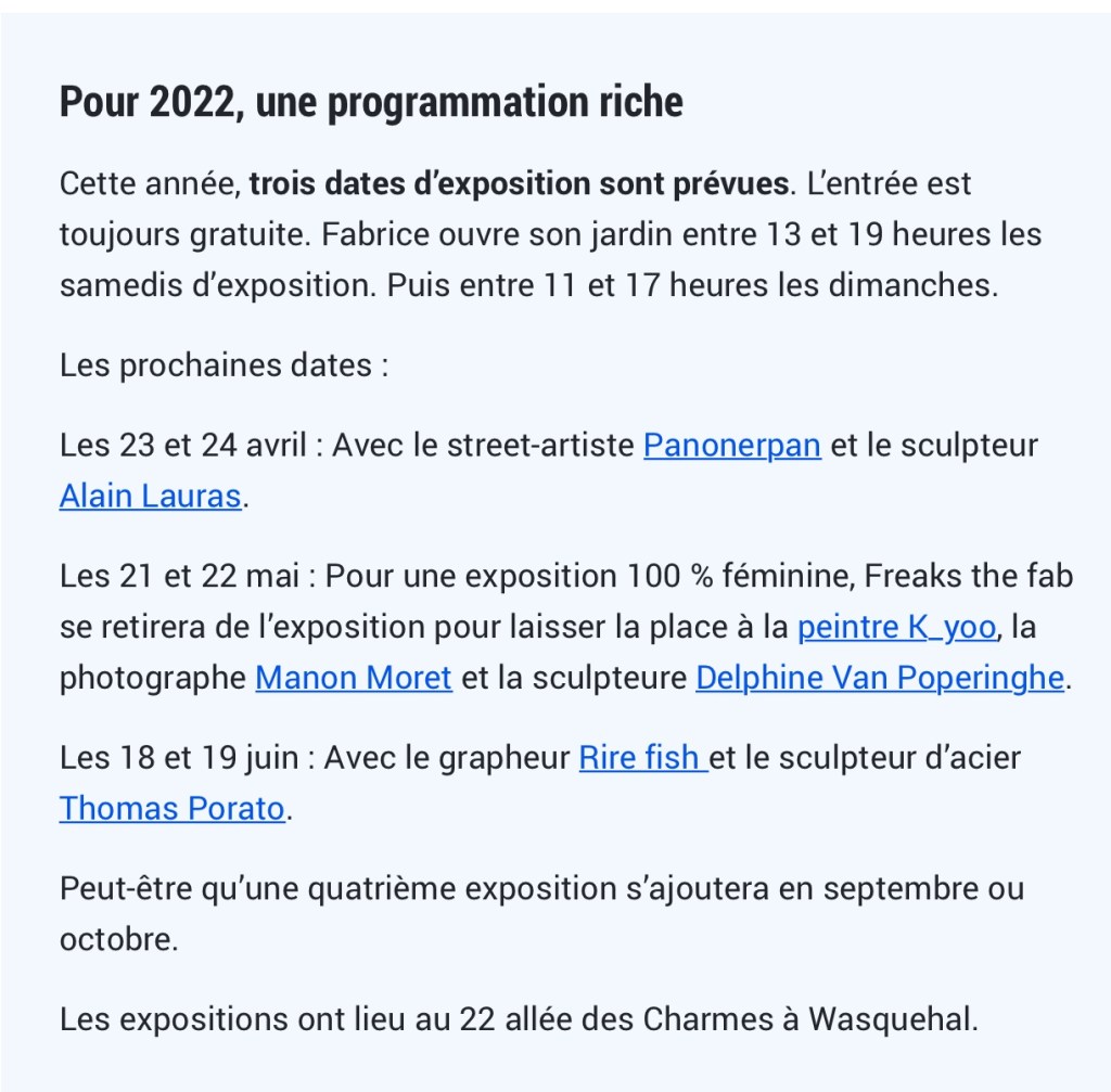 Avril 2022 La Voix du Nord : Wasquehal: il organise des expositions dans son jardin pour «rendre l’art accessible»