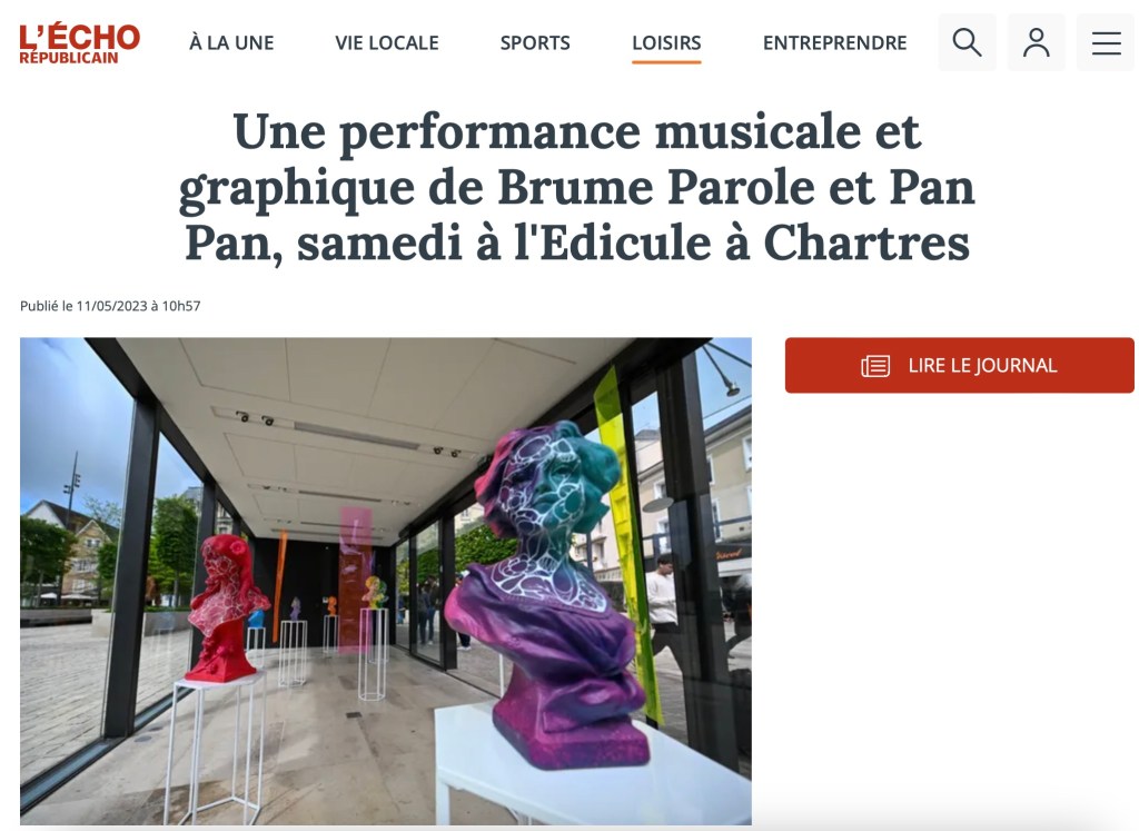 Mai 2023, Echo Républicain : Une performance musicale et graphique de Brume Parole et Pan Pan, samedi à l’Edicule à Chartres